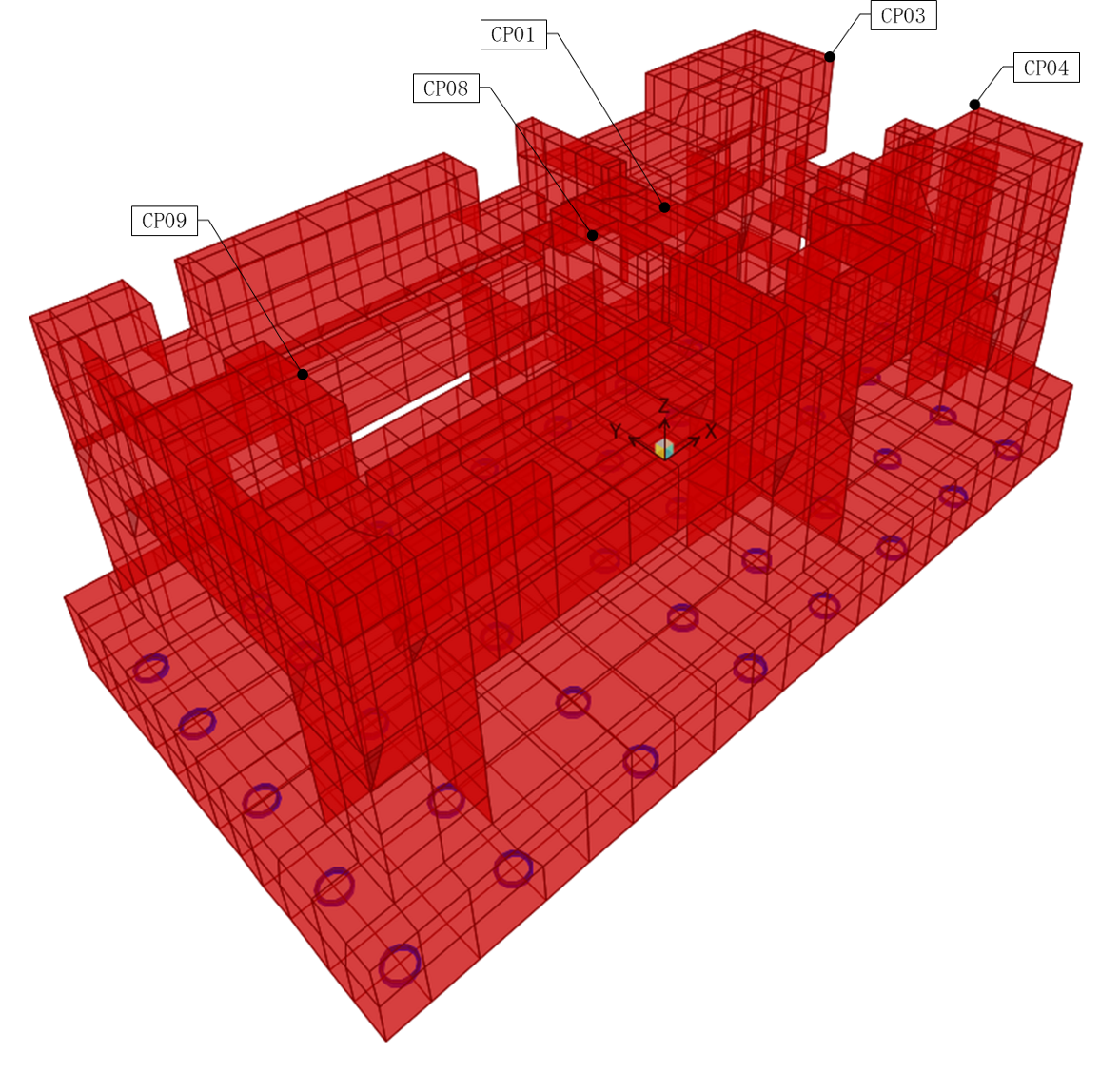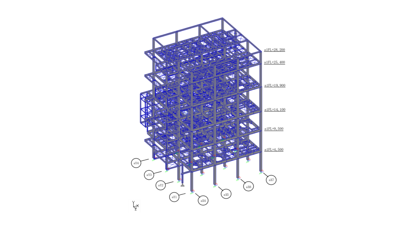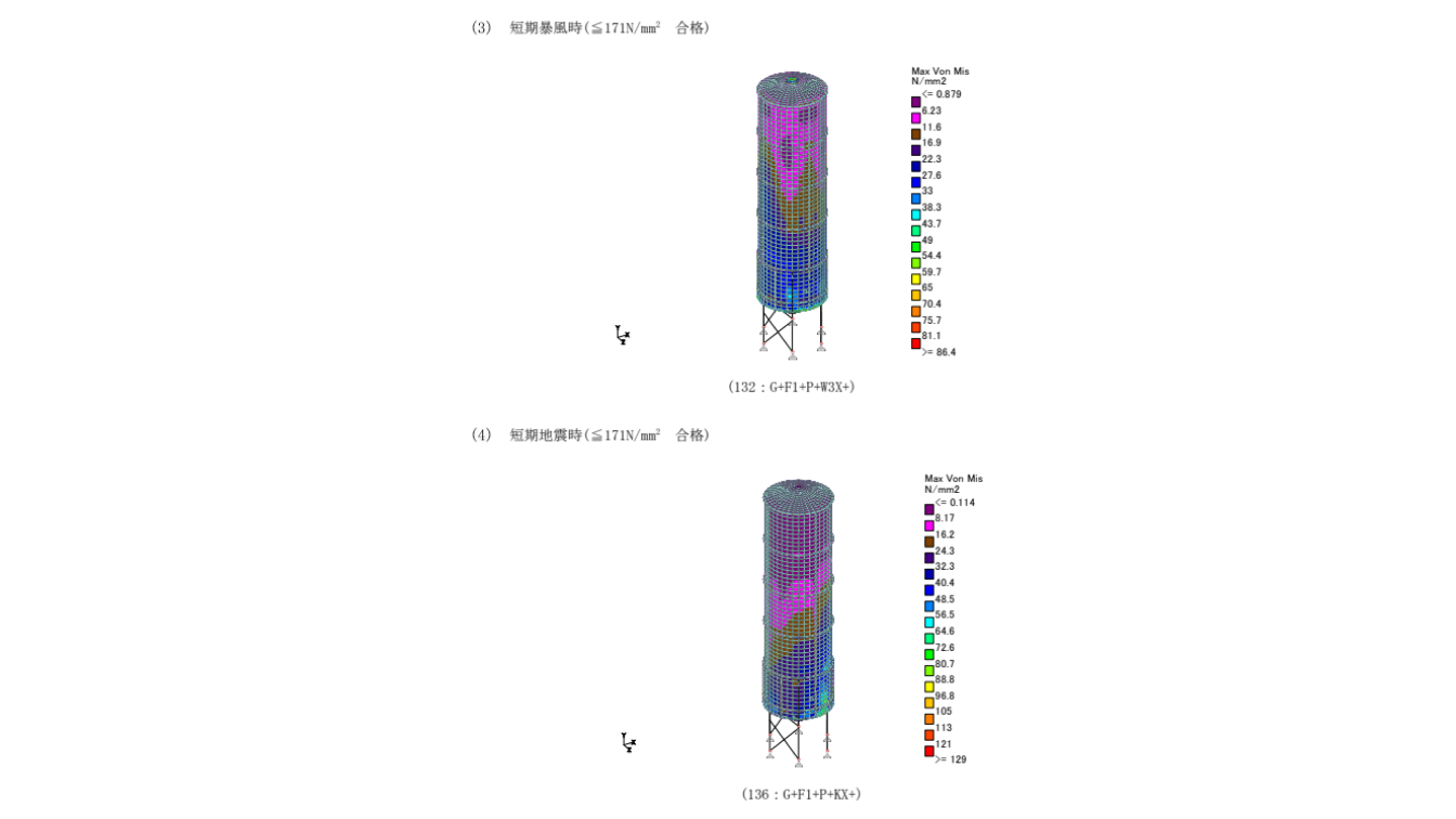 - 設計概要 グランドフレア本体のFEMによる解析、構造計算。耐震設計を工作物、JEAC-3605レベル1、レベル2(代替評価)による耐震設計。許容応力度は煙突指針(日本建築学会)を適用。