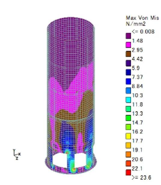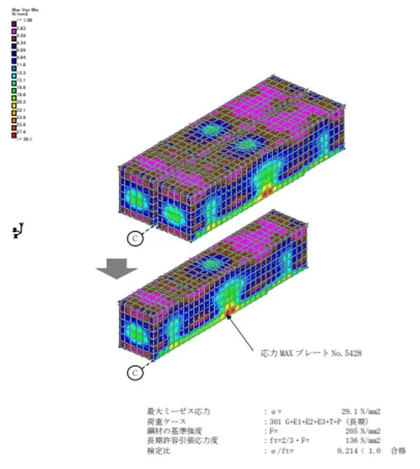 - 設計概要 レドックスフロー電池コンテナの鉄骨骨組み及び鋼製プレートの強度検討、電解液荷重、配管熱荷重、配管圧力荷重等の考慮。
